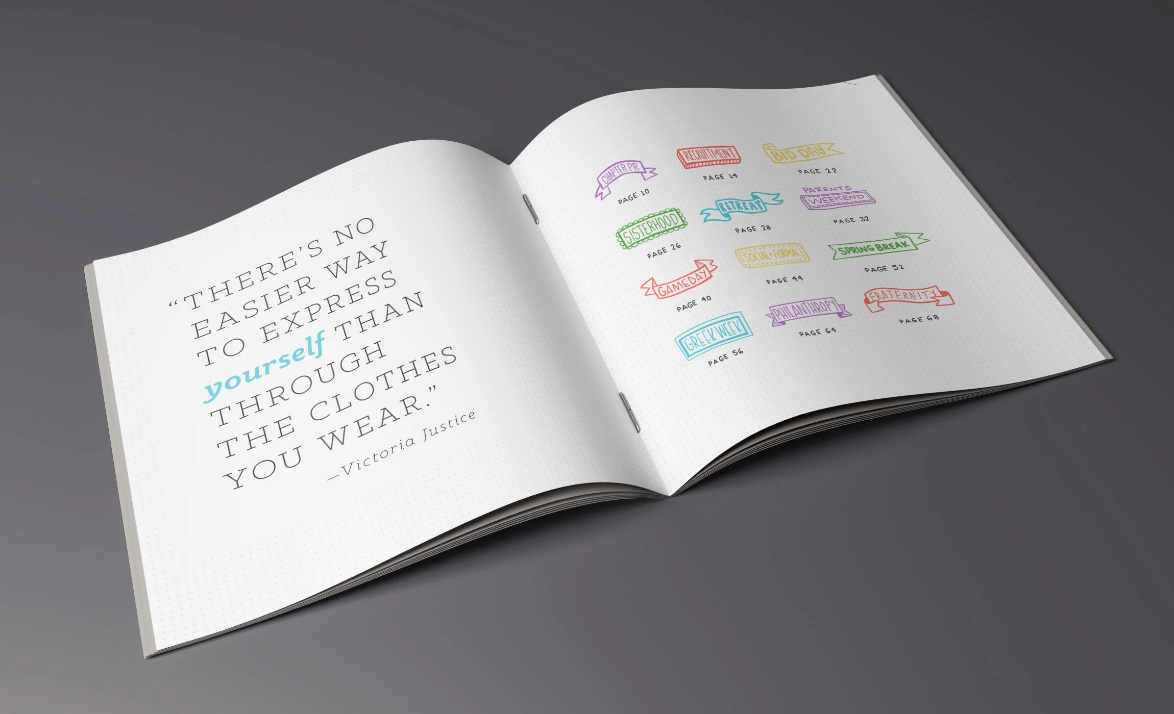 This book was designed to promote sales and provide inspiration for the 2018-2019 school year. It was completed by a team with one other lead designer, including myself, photographer, creative director, and copywriter to concept, design and print and distribute 5,000 copies to our on campus sales team. Final book was perfect bound with embossed pattern on the cover.
